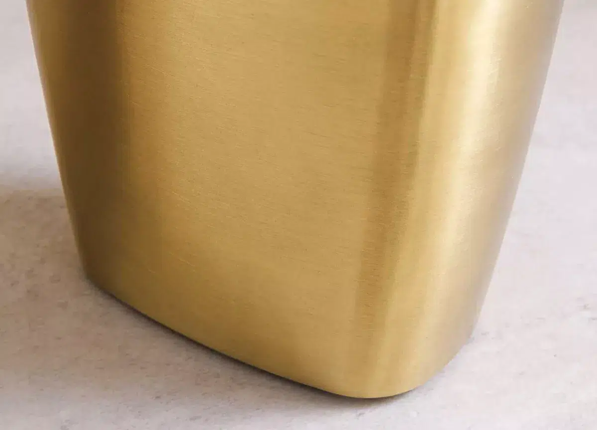 Elle attire le regard sans jamais l’imposer. Cette table ovale de 200 cm combine un plateau aspect marbre aux contrastes assumés, noirs profonds, veines minérales, éclats plus clairs, comme une surface qui vit, réfléchit la lumière, change selon le moment de la journée. Ses trois pieds aux formes arrondies et pleines, en finition dorée satinée, lui donnent une posture stable, presque sculpturale. Pas de lignes agressives, pas de brillance criarde : un doré doux, chaleureux, qui fait respirer la pièce. La forme ovale adoucit l’espace et favorise la discussion. On ne se fait pas face, on se tourne, on échange — fluide, naturel.