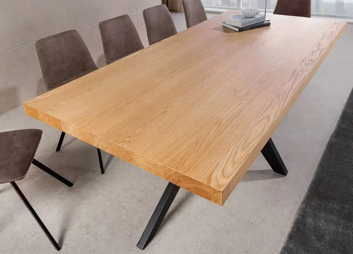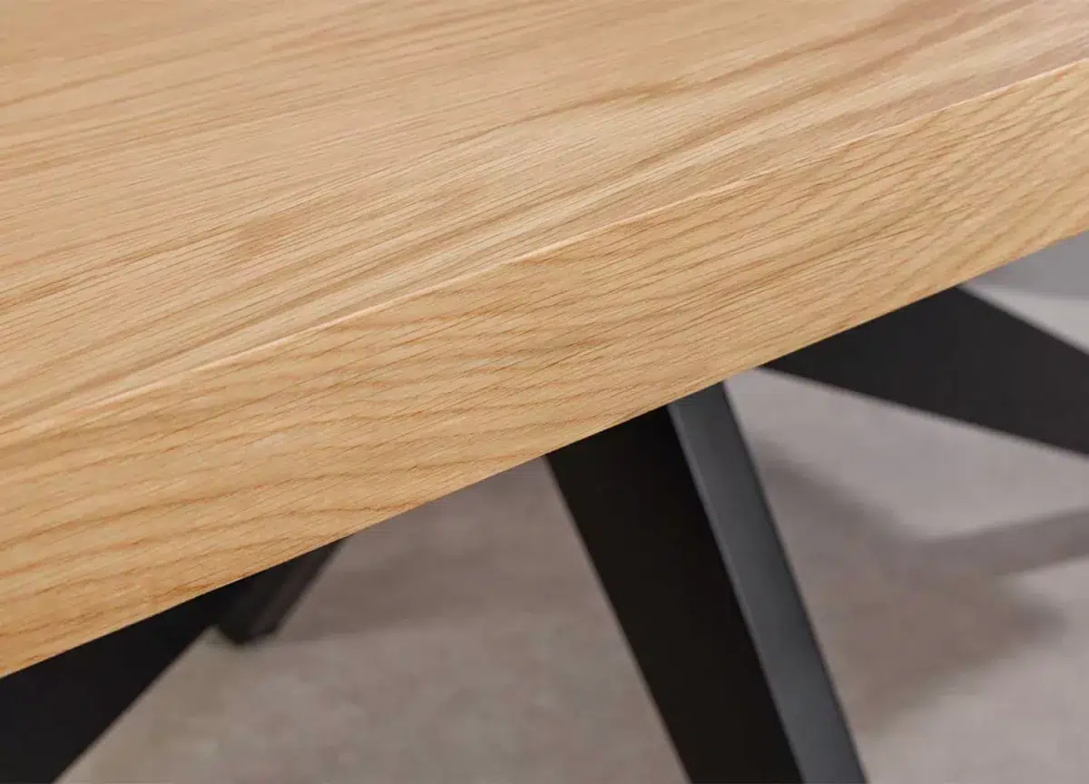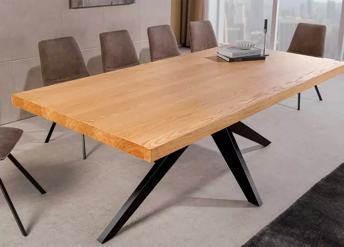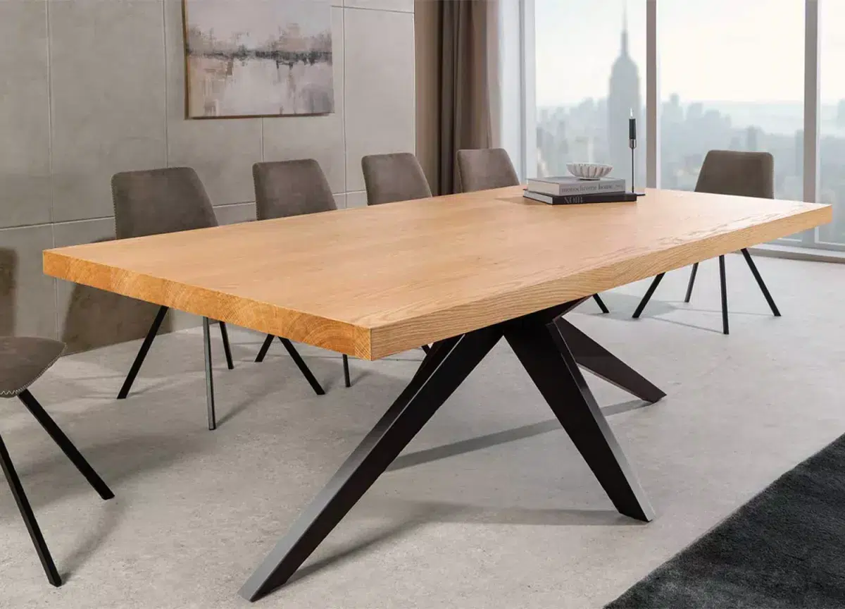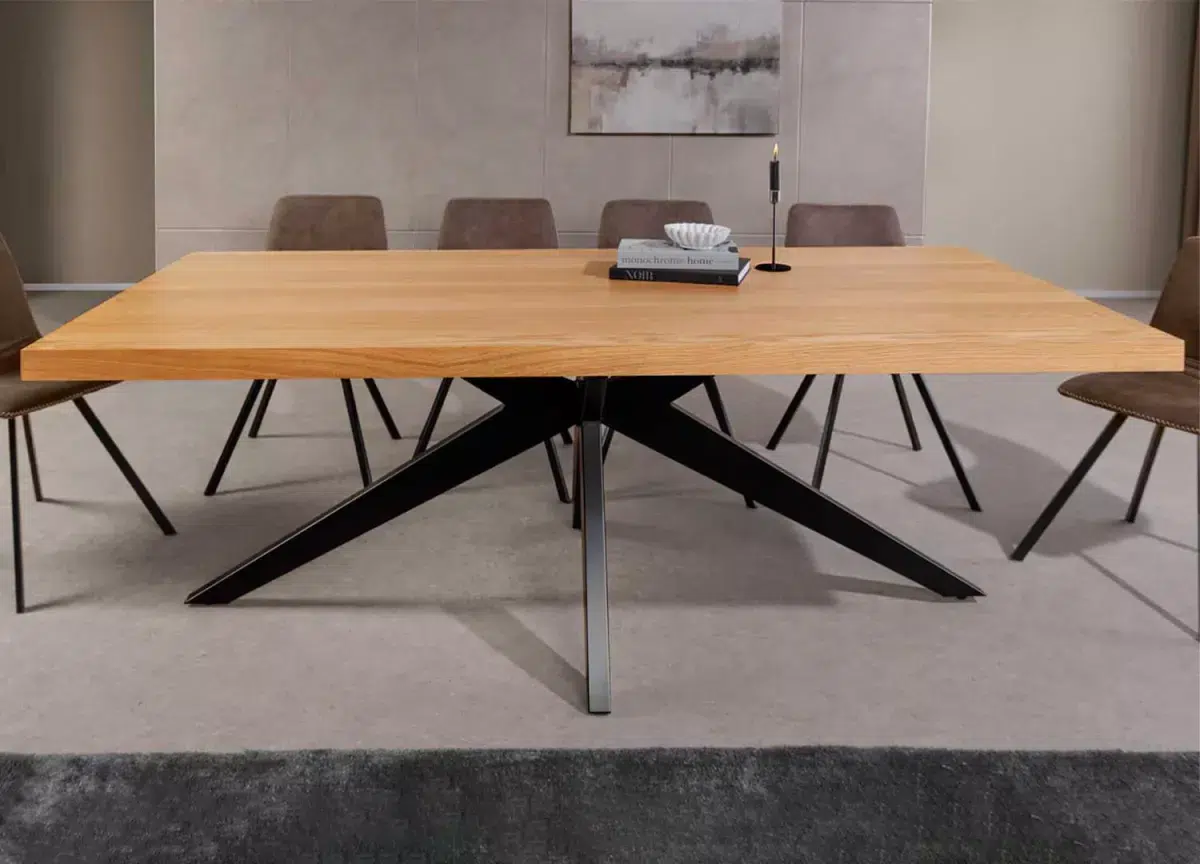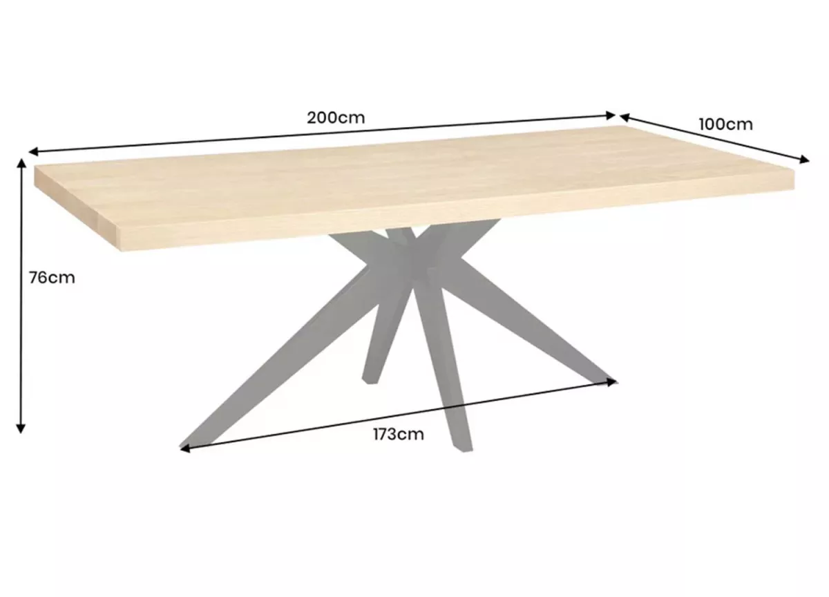 Avec son large plateau en bois clair et sa base en métal noir aux lignes géométriques, cette table de 200 cm allie modernité et caractère. Son design joue sur les contrastes : la chaleur du bois s’oppose à la structure métallique, fine mais solidement ancrée au sol, offrant une silhouette à la fois aérienne et robuste. Le piètement en étoile, sculptural et équilibré, donne une impression de légèreté tout en garantissant une stabilité parfaite. Idéale pour accueillir 8 à 10 personnes, cette table devient le point central de la pièce, un espace où se mêlent convivialité, élégance et style contemporain.
