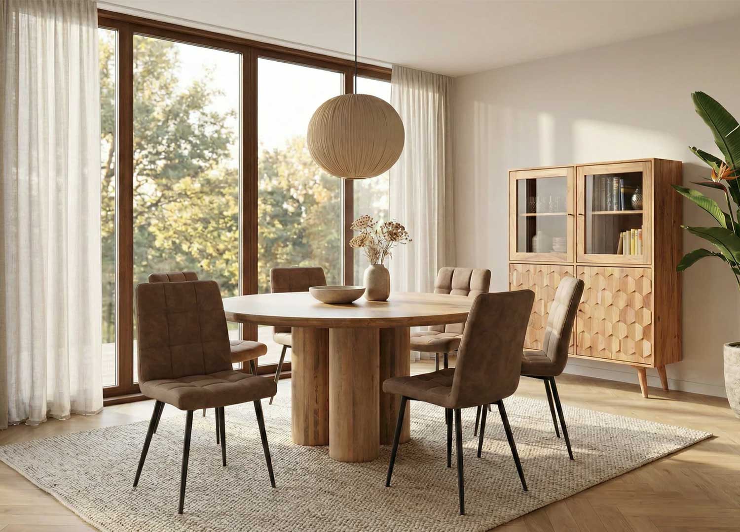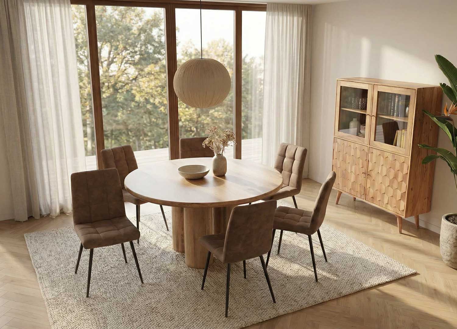 Avec son diamètre de 140 cm, cette table ronde offre un bel espace pour partager les repas du quotidien comme les moments plus festifs. Conviviale et raffinée, elle accueille confortablement 4 à 6 personnes pour vos repas du quotidien comme vos moments partagés, et trouve facilement sa place dans un intérieur naturel ou inspiré de l’art déco.