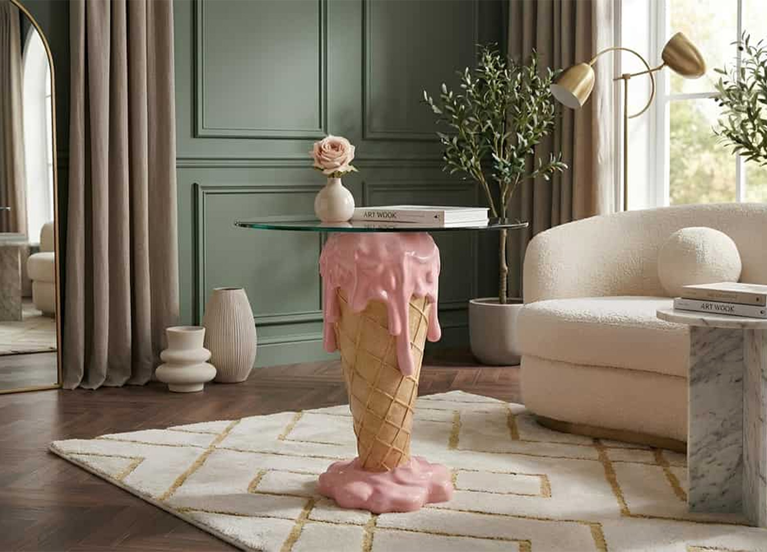 Avec son piétement inspiré d’une glace qui semble doucement couler et son plateau rond en verre trempé, la table basse Gelato apporte au salon une touche aussi joyeuse qu’inattendue. Sa palette rose et beige adoucit l’espace, tandis que sa silhouette sculpturale transforme un simple meuble d’appoint en véritable pièce décorative. Ludique sans être enfantine, originale sans perdre en élégance, elle insuffle une note pop et raffinée à l’intérieur.