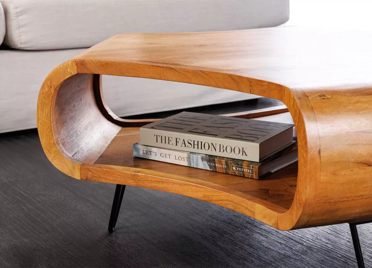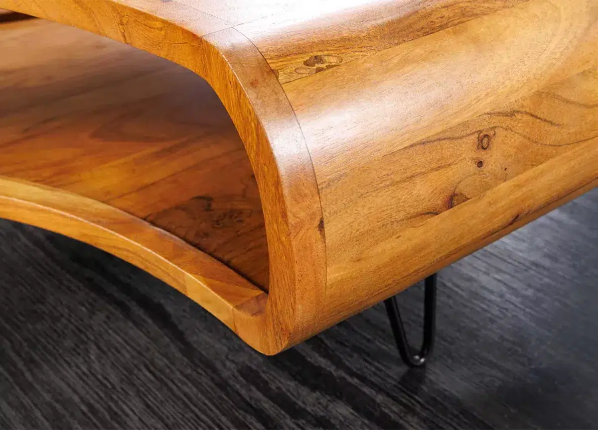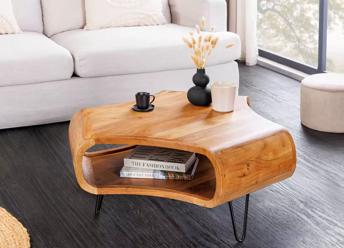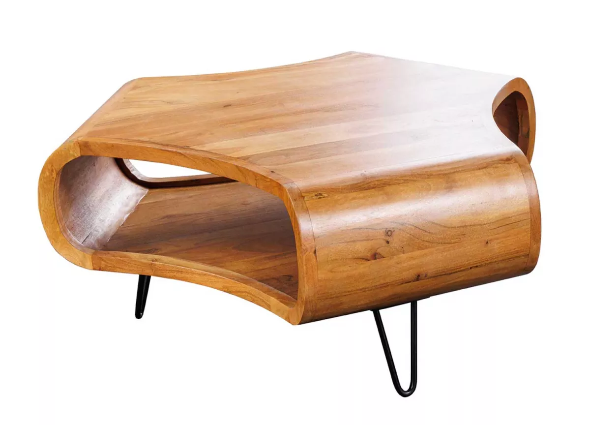 Cette table basse en bois d'Acacia aux formes arrondies va radicalement changer l'aspect de votre salon. Grâce à l'originalité de ses formes, elle permet une élégance hors du commun. Le piétement en épingle permet de compléter la simplicité de la table basse tandis que le bois d'acacia imposant et chaud vient donner la touche esthétique finale à la table de salon. Vous pouvez aussi découvrir cette table en table d'appoint, moins imposante et plus haute !