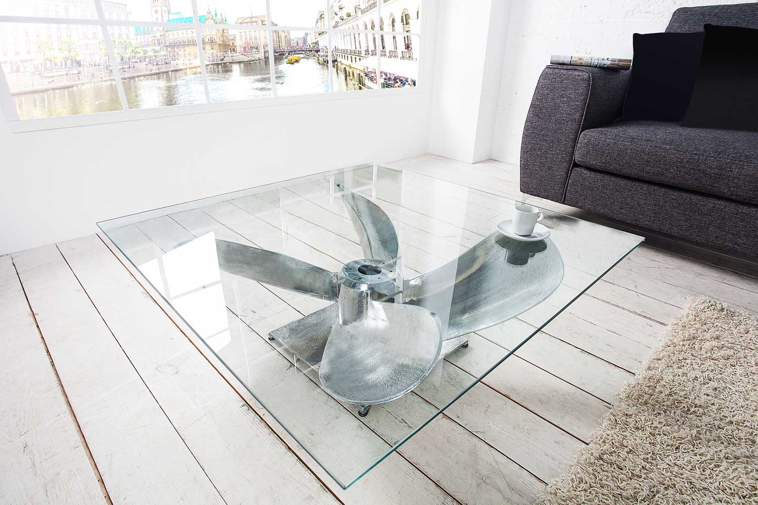 Table basse en verre avec pied hélice de bateau