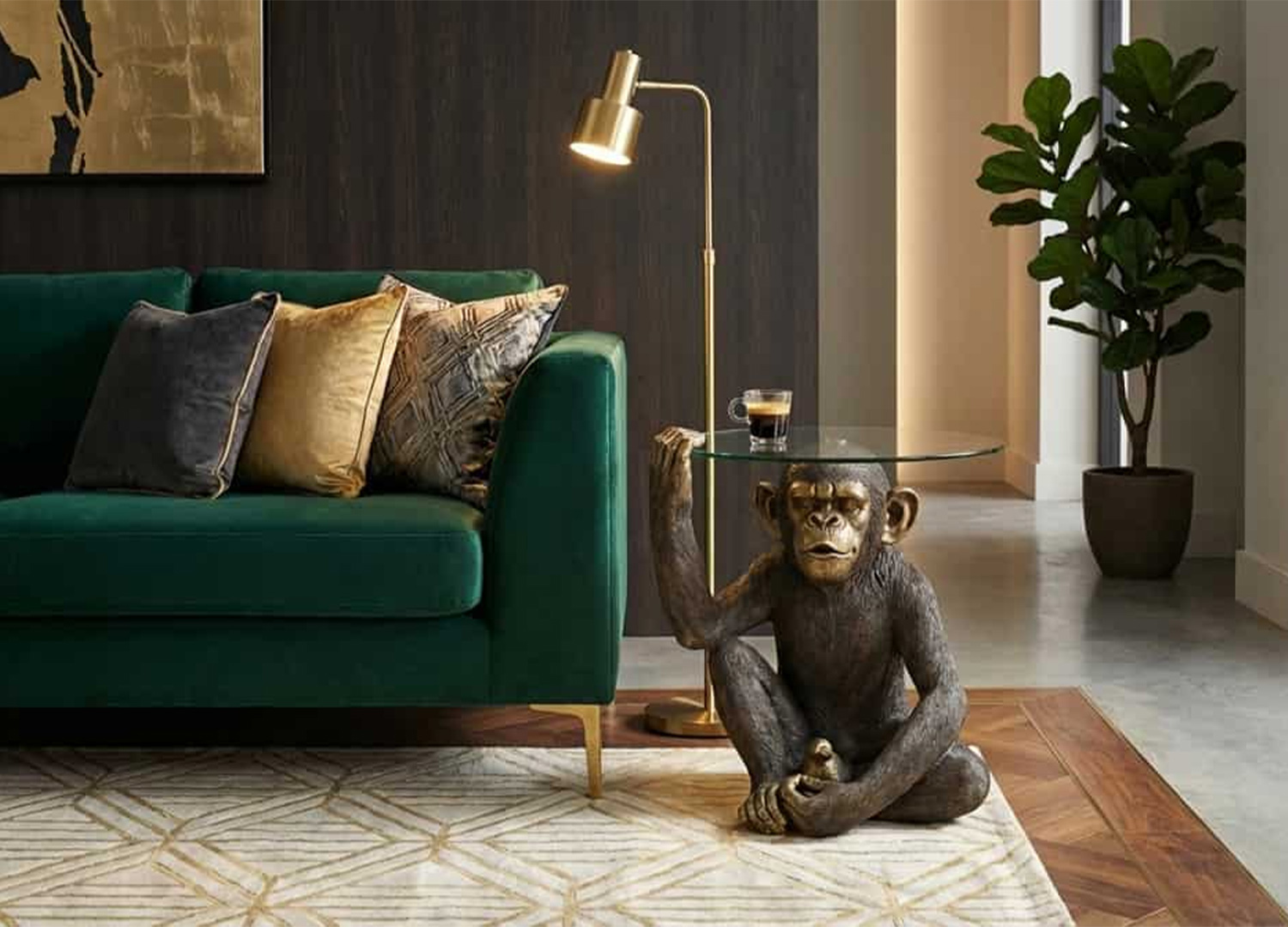 Nous sommes prêts à faire entrer une vraie pièce de caractère dans votre intérieur avec cette étonnante table basse. Son singe noir et doré, à la fois sculptural et expressif, porte avec assurance un plateau en verre trempé. Originale, décalée et résolument décorative, cette table ne passe pas inaperçue. Plus qu’un meuble, c’est un véritable objet de conversation, pensé pour réveiller le salon avec une touche glamour, théâtrale et pleine de personnalité.