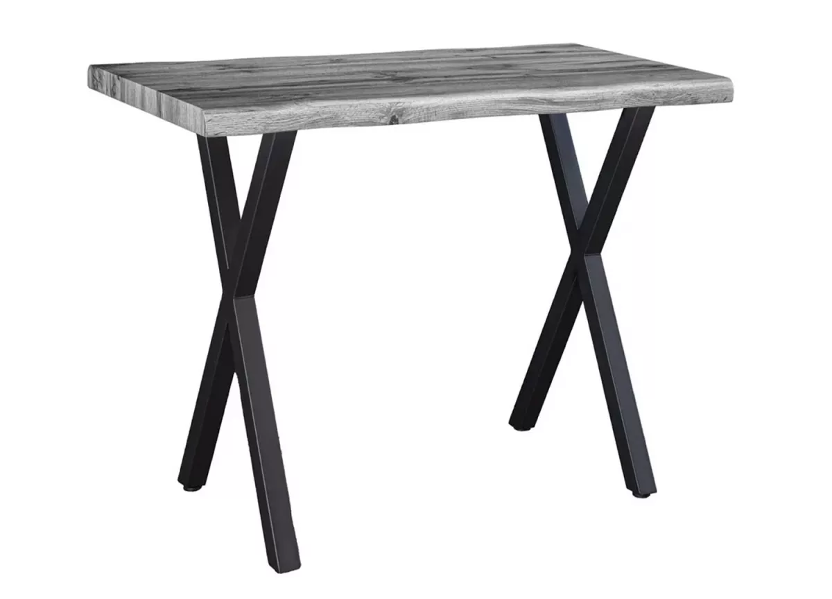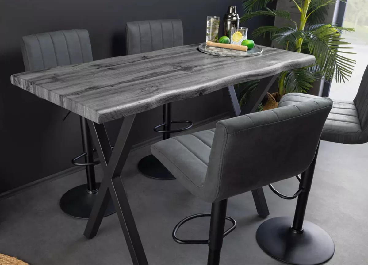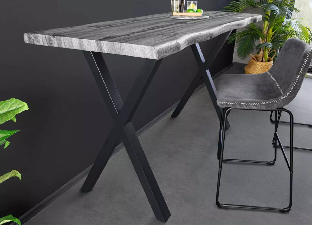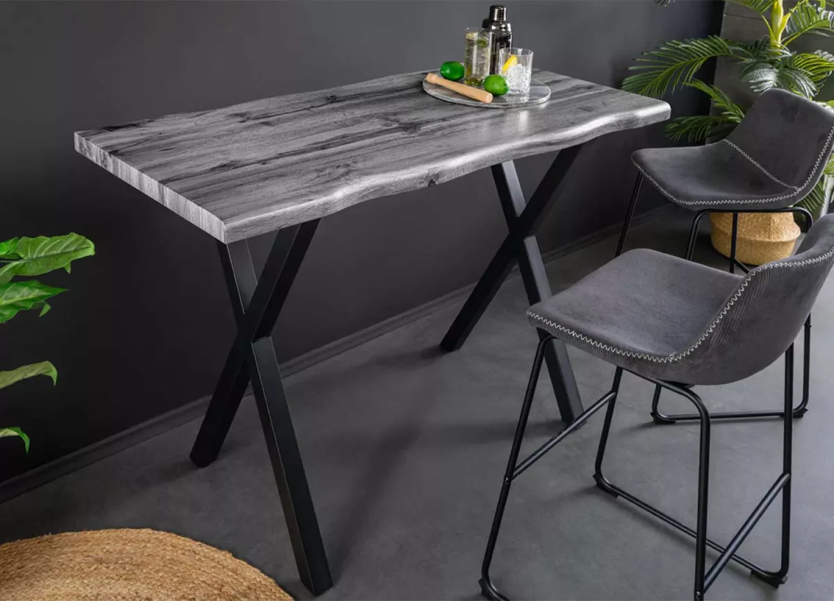 Élevée sur ses pieds croisés en métal noir, la table de bar domine la pièce avec une élégance brute. Son plateau en bois grisé, aux reliefs légèrement irréguliers, capture la lumière et en révèle chaque veinure — comme si la nature avait laissé sa signature sur chaque centimètre. Sa hauteur invite à la convivialité : on s’y retrouve debout, un verre à la main, ou perché sur un tabouret, à refaire le monde. À la fois robuste et raffinée, elle allie la solidité d’un atelier industriel à la chaleur d’un mobilier artisanal.