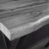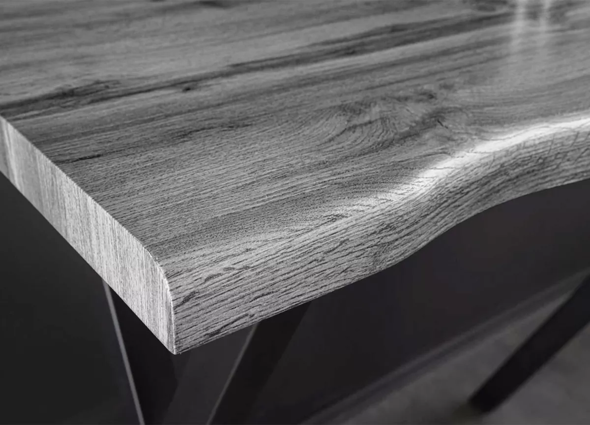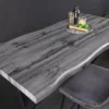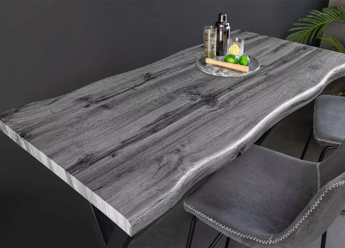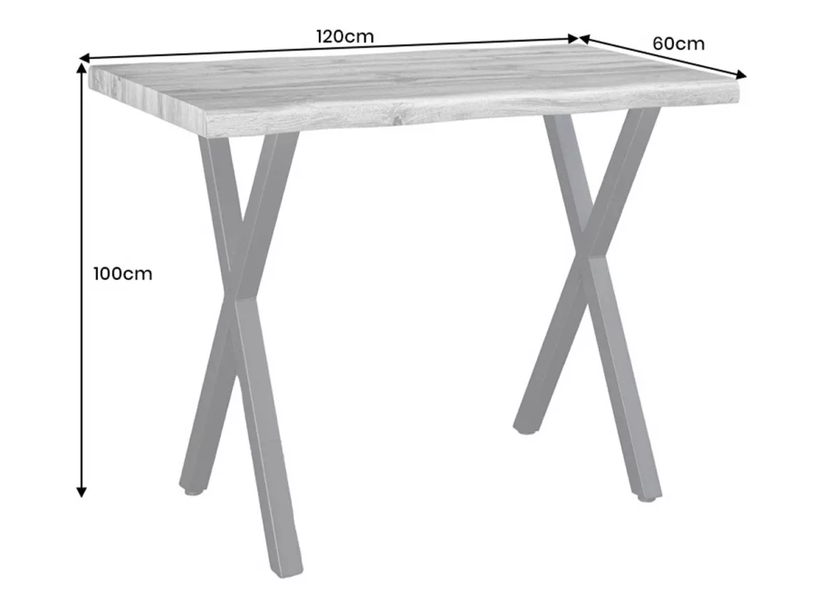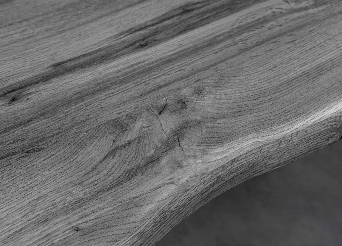 Élevée sur ses pieds croisés en métal noir, la table de bar domine la pièce avec une élégance brute. Son plateau en bois grisé, aux reliefs légèrement irréguliers, capture la lumière et en révèle chaque veinure — comme si la nature avait laissé sa signature sur chaque centimètre. Sa hauteur invite à la convivialité : on s’y retrouve debout, un verre à la main, ou perché sur un tabouret, à refaire le monde. À la fois robuste et raffinée, elle allie la solidité d’un atelier industriel à la chaleur d’un mobilier artisanal.