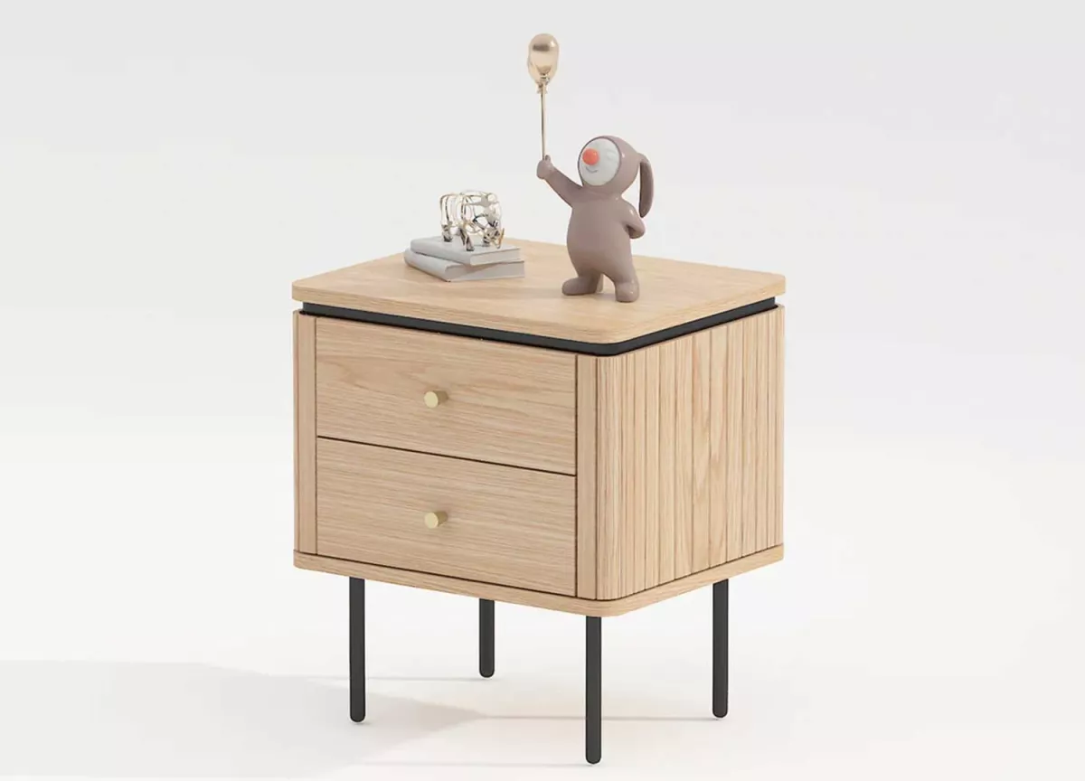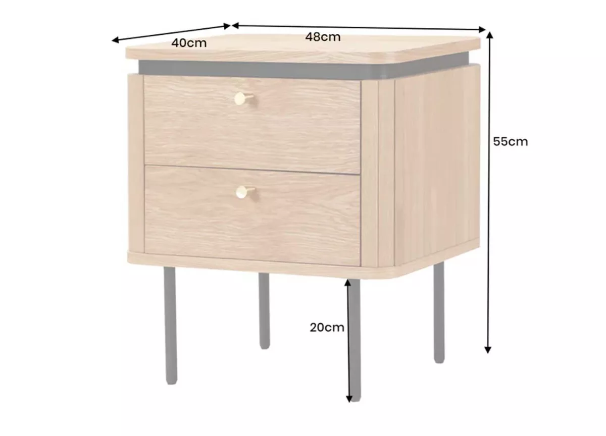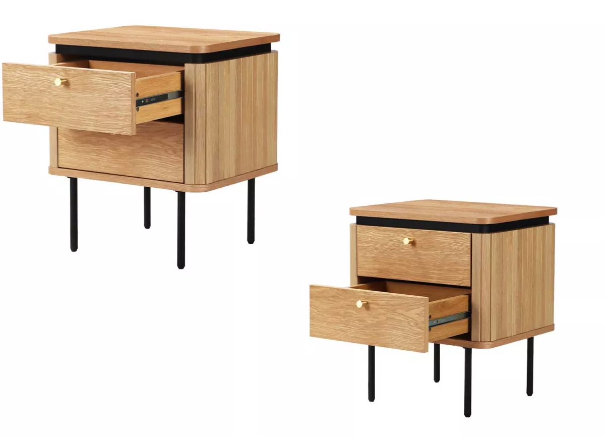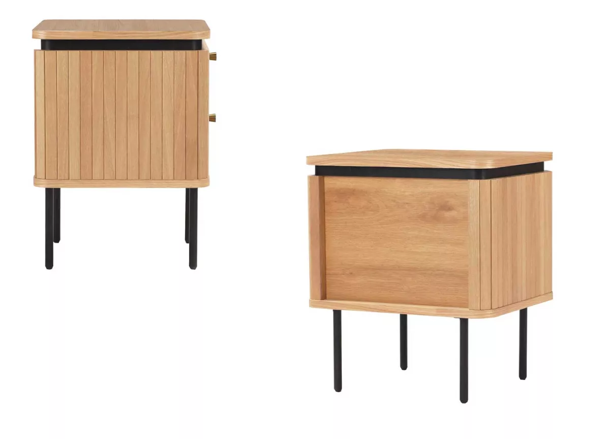 Avec son placage chêne strié qui capte subtilement la lumière et ses lignes arrondies, cette table de chevet allie douceur et modernité. Ses deux tiroirs discrets accueillent vos indispensables du quotidien, gardant l’espace apaisé et parfaitement organisé. Portée par de fines jambes en métal noir, elle semble s’élever avec légèreté, apportant une touche aérienne à la chambre. Plus qu’un simple meuble de rangement, c’est une pièce déco raffinée qui complète la collection avec élégance et sobriété.