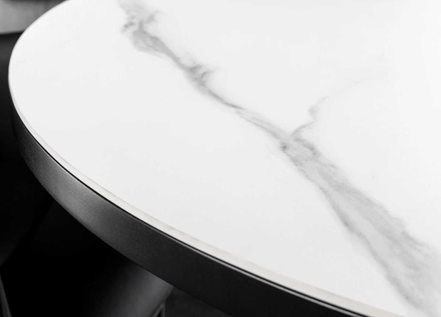Son plateau en céramique effet marbre blanc, associé à un support en verre trempé, séduit par sa surface lisse, pensée pour rester belle et facile à vivre au fil des usages. Le veinage inspiré du marbre apporte une note tendance. Sous ce plateau, le piétement en métal noir dessine une base graphique qui structure l’ensemble avec modernité.